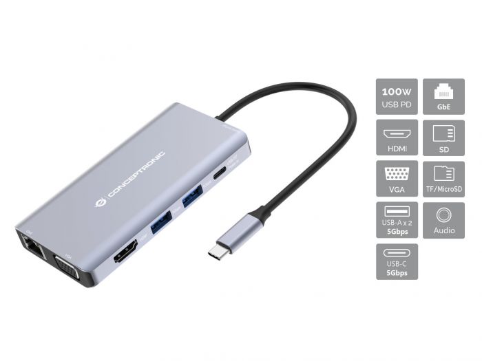 DONN20G 10-in-1 USB 3.2 Gen 1 Dockingstation, HDMI, VGA, USB-A 5Gbps, USB-C 5Gbps, SD, TF/MicroSD, Audio, GbE LAN, 100W USB PD