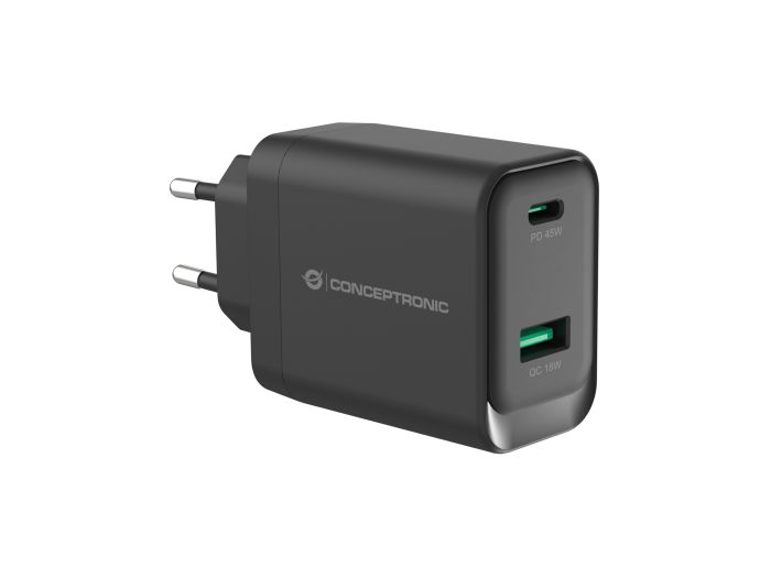 This charger leverages advanced Gallium Nitride (GaN) technology to provide up to 45W of total power, delivering faster and more efficient charging. It features a versatile port selection with 1 USB-C port supporting USB Power Delivery (PD) 3.0 and 1 USB-A port with Quick Charge (QC) 3.0, allowing for simultaneous charging of multiple devices with different power needs. The charger supports a wide range of output options from 5.0V to 20.0V, ensuring compatibility with a variety of devices, including smartphones and laptops. Enhanced safety is ensured with built-in protections against overload, short circuiting, and overheating. Additionally, it incorporates USB Power Delivery (PD) 3.0 and Quick Charge (QC) 3.0 technologies for rapid charging, along with Programmable Power Supply (PPS) compliance to maximize efficiency and minimize heat generation.