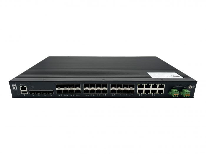 IGU-2872 28-Port L2 Plus Managed Gigabit Fiber Industrial Switch, 4x 1.25/2.5GbE SFP, 16x 1.25GbE SFP, 8x Gigabit SFP/RJ45 Combo, Redundant Power Supply, -40°C to 80°C