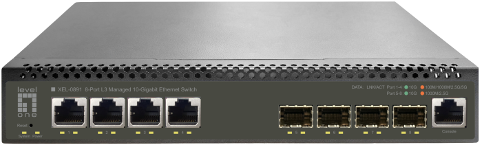 The LevelOne XEL-0891 is a high-performance Layer 3 Managed 10-Gigabit Switch with 8 × 100M/1G/2.5G/5G/10G RJ45 ports and 4 × 1G/2.5G/10G SFP+ slots. It offers flexible CLI/web management with SNMP, and supports advanced Layer 3 features including IPv4/IPv6 Static Routes, RIP v1/v2, OSPF v2 and BGP-4. the XEL-0891 delivers robust performance and scalability—an ideal solution for SMBs, workgroups, and edge network deployments seeking efficient and cost-effective expansion.