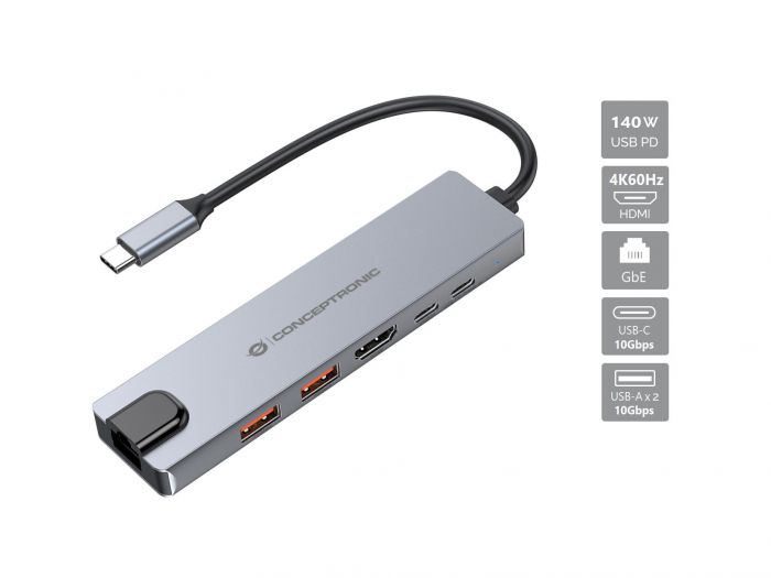 Questa docking station 6-in-1 espande la funzionalità USB Type-C del tuo dispositivo con porte HDMI, USB-C PD, USB-C (10Gbps), USB-A (10Gbps) e RJ45. È una soluzione ideale per MacBook o laptop Windows con connettività wireless integrata ma senza porta Ethernet. Dotata di una connessione Gigabit Ethernet, garantisce un accesso alla rete cablata veloce e affidabile. Inoltre, la docking station supporta un'erogazione di potenza fino a 140 W per laptop o tablet compatibili con supporto USB-C PD 3.1.